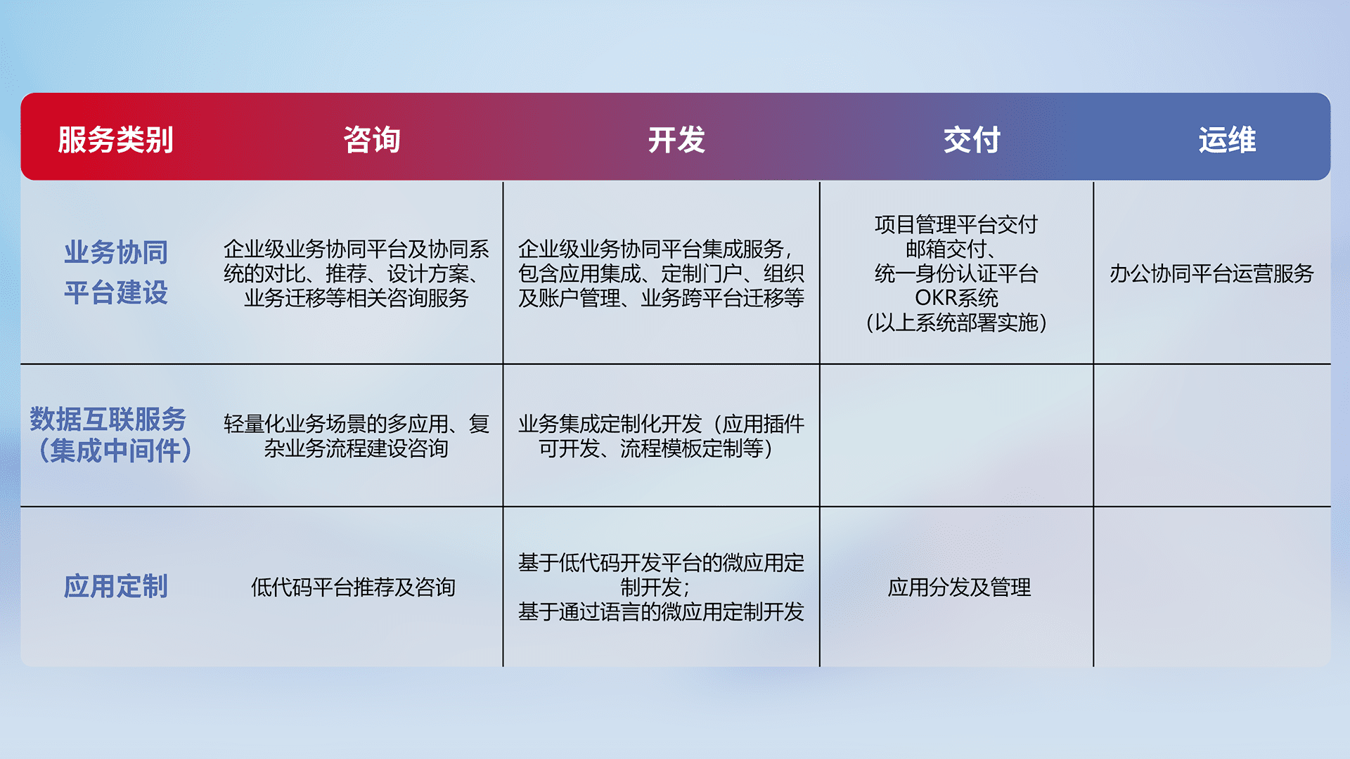 针对钉钉、、、、企微、、IDaas等平台级产品提供产品的规划、、、方案、、交付、、、、定制化开发等服务,,实现如统一协同办公、、、、智能客户服务、、、混合会议管理、、智能数据查询、、等业务场景,,,,实现数字化转型。。